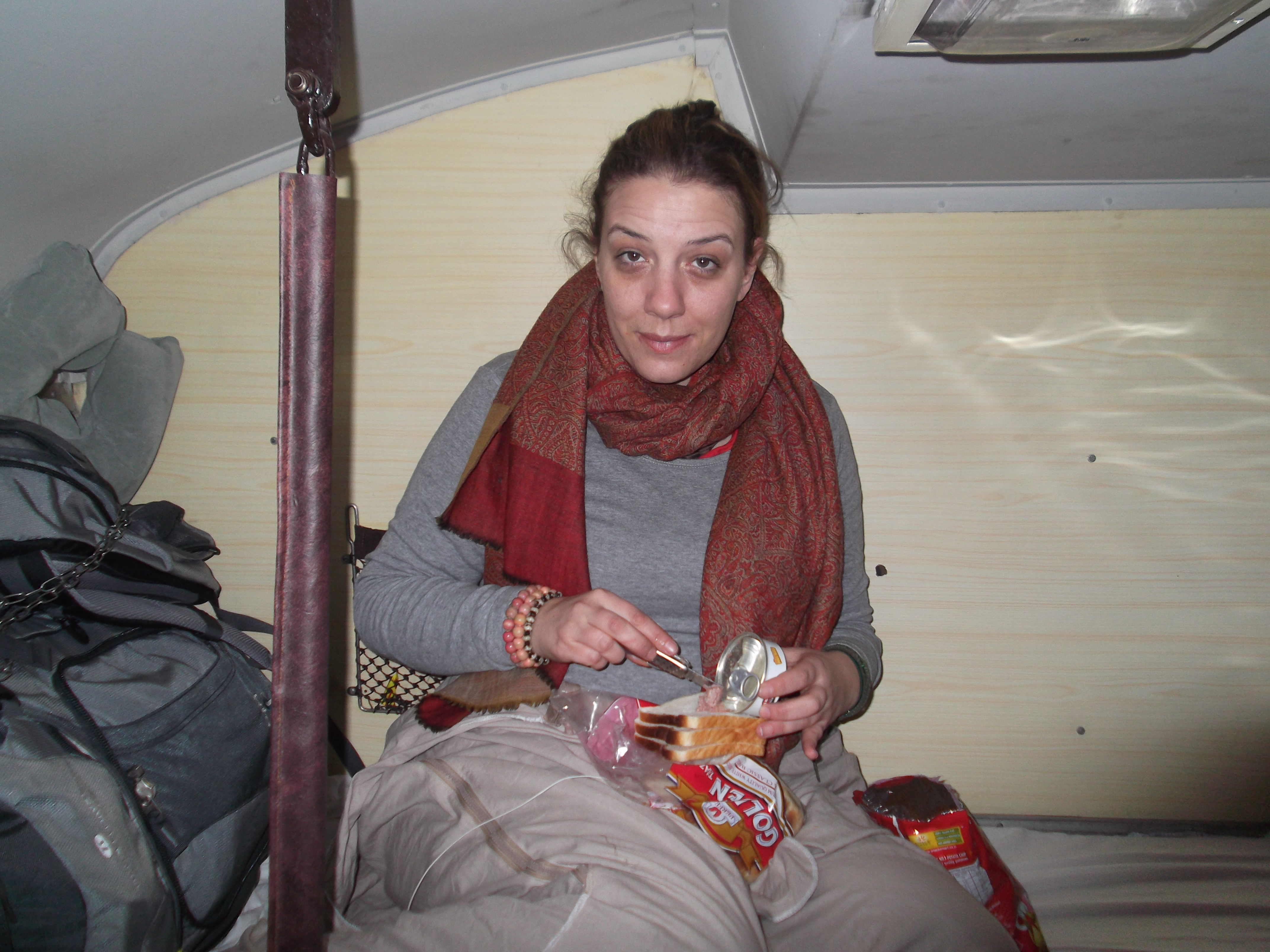 En el tren, aunque era un poco complicado, ya que teníamos las camas en las literas de arriba y teníamos que poner las mochilas, con cadena, y meternos en el saco-sábana (para no tocar mucho lo de allí), nos resultó bastante cómodo y conseguimos dormir bastante bien. No hacía ni frío ni calor, y aunque se oía hablar a la gente, eso a nosotras no nos preocupaba, igual que cuando encendían la luz, ya que al trabajar de noche en Madrid dormimos normalmente durante el día en nuestra vida diaria y estamos acostumbradas. Por la mañana, en la litera de debajo de Rosa se colocó un señor que nos turbió un poco el viaje…ya que de vez en cuando se tiraba unos pedetes que intoxicaban a todo el vagón…jajaja, pero se queda como anécdota.