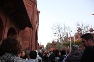 Llegamos a la puerta «West» a comprar las entradas y somos de las primeras, pero hasta en la India esta el típico listo que se intenta colar, este no sabe con quien esta tratando, que hay una vallekana…jeje. Tras un largo tiempo de espera y sin que abrieran las ventanillas de venta de ticket, nos divididos (la gente se reparte las tareas, uno compra entradas, otro se pone a la cola de acceso). Estela se queda comprando las entradas con su maravilloso inglés «Two Tickets» y yo me dirijo con el mío (aún peor) a la fila que me corresponde de las cuatro que existen (Ladies, Indian Ladies, Gentleman, Indian Gentleman).